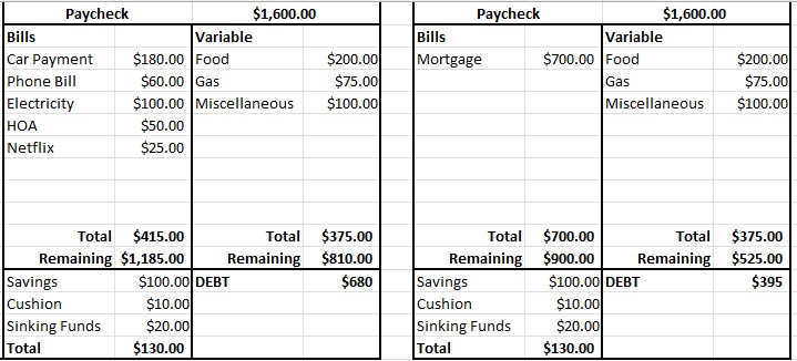 How it works is the Bills (top left below paycheck) are subtracted from the Paycheck amount at the top. Bills are fixed expenses with a set/similar dollar amount and/or payment date like your rent, mortgage, car payment, or utility bills. Next Variable (top right below the paycheck amount) spending (meaning it doesn’t have a set amount such as food, gas, and miscellaneous spending) is deducted. Following variable spending are Savings, Sinking Funds (expense or expenses saved over time), and checking account Cushion (bottom left). The remaining amount is how much is left to payoff Debt (bottom right). In this example, the first paycheck has an extra $680 to devote to debt and the second paycheck has an extra $395 to devote to debt.