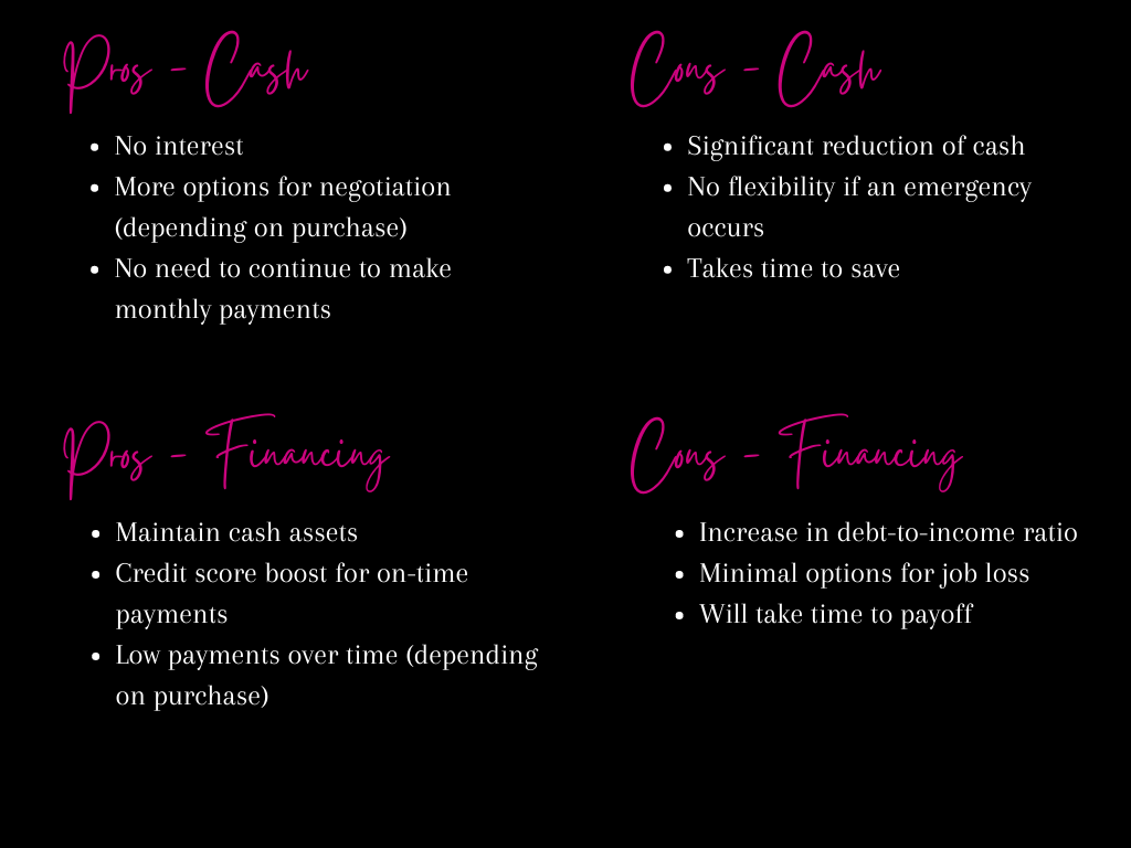 You may have been wondering if you should drop a stacks of cash on major purchases. The answer is…it depends. Yeah, I know that’s a vague answer but it’s for a very good reason. So let’s make a pros and cons list to see if you should finance or pay cash for your next big purchase: