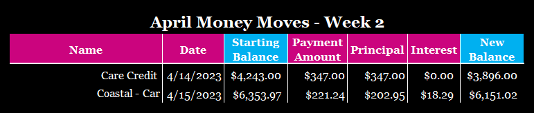 All of it was at the end of the week if you can’t tell. I should be offended, lol! As for my current totals after I’ve made my payments for this week: