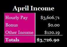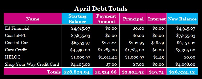 One thing I forgot to add is how much interest I accrued in my accounts. All of my accounts are interest yielding and I wanted to include that in April’s totals.