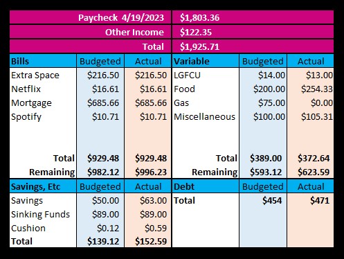 These last paychecks normally have some fixed numbers and this one was no exception. For my other income I received $109 because I share my storage unit. I collected $2.16 from my Discover Rewards. I charged a little over $50 to Discover during late March and April. I also received $2.79 in interest for my checking account and $8.40 in interest for my money market.