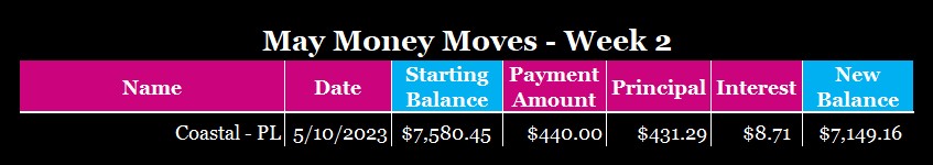 This loan was on hiatus since December and I decided to revive it for now because it’s accruing interest and my Shop Your Way and Care Credit card are 0% interest until November 2023 and January 2024. This is the perfect chance to throw everything I have at it and the balance is dropping in the best way I can imagine. We still have 10 payments to go before putting the brakes back on with this debt but It’s really going to make a big difference as the balance continues to dwindle.