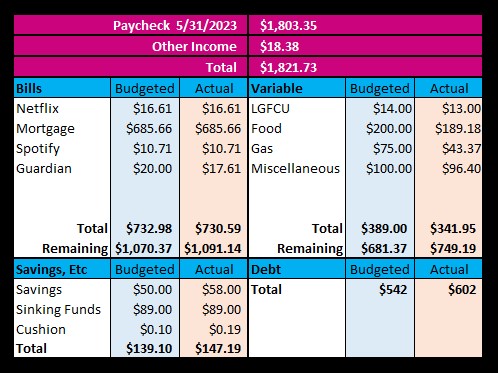 Based off my personal opinion. Things went GREAT! I brought in my regular paycheck amount plus $2 in interest that accrued in my checking account, $7.95 that accrued in my Money Market, and $8.43 in rewards I accrued from Upside. My Guardian bill (water) is the only one that had a minor adjustment, leaving an extra $3.39 in the budget. In my variable categories, even with filling up my gas tank for the first time in over 3 months, I budgeted $389 for everything and spent $341.95. In my Savings category, $50 was deposited to my Money Market along with $89 for my sinking funds. I accrued $7.95 and did a round up of $.05 so I would have an even number. Once that was all said and done, I originally had a remainder of $542 to put toward debt, but after everything was all said and done, it was a total of $602. I never just make a straight payment for these amounts. If you want to see the breakdown, check out my Money Moves Monday posts. I’m thinking of beginning to post the payment breakdowns for the month so you can see exactly how I applied them on my Money Moves Month-End posts along with all of the other things I love to share including my net worth update.