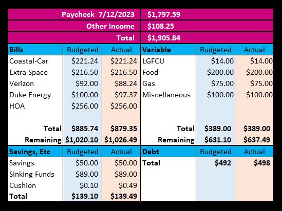 The biggest difference that was expected for my bills was Guardian which is my water bill. I anticipate total of $20 to be spent on water for the month because it’s just me, but as you can see…I went way below for this final pay period and I believe this was highlighted when I highlighted this paycheck in June. While that was great and all. I did the absolute best for my variable spending and that was without even trying!!! I did go over my food budget by $36.02, but I was way under my Gas budget by $42.97, and my Miscellaneous budget by $76.80. Over all I budget for $389 initially and spent $305.35. As for my Savings. The bulk of what I gained in other income went to my high yield savings. It was a total of $9 in interest I accrued, my Sinking Funds stay set for now at $89. Come August I will reduce that amount and it’ll be visible in my paychecks. The last thing I want to say was oh…my…GOD! I always expect to pay a little extra before the paycheck closes but look at the differences between the debt budgeted and actual debt!!! I anticipated to pay $537, I paid $631!!! That’s almost $100 in extra payments! I need to keep things in check for now so I can keep up with these amazing numbers. It’s unreasonable to hope for that but a gal can dream. I’ll share my updated debt numbers next Money Moves Monday. 😊