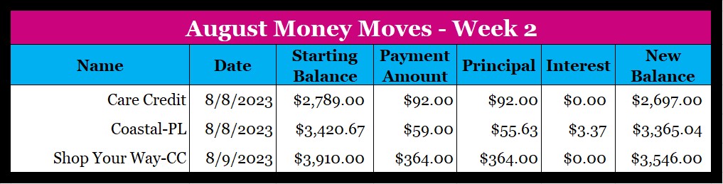 This week was so much better than last week and I’ll tell you the reason why momentarily but I have officially started on a new debt! That payment to my Coastal-PL was the last payment I’ll be making until my Care Credit and Shop Your Way credit cards are paid off. My personal loan is paid through February 2024 and I’ll get back to paying it down a couple of months before it’s due again.