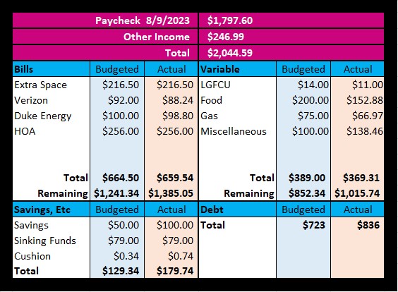 Let’s start with my income for this paycheck. The first thing is I received $109 for the storage, a whopping $64.38 in credit card rewards (I’m very proud of this number), I was able to cash in a bit quicker for Ibotta at $23.61, and I did a favor for a friend and received $50 and that’s how I got more in other income than I normally do. Things have been seeming higher than normal and I’m okay with it anytime it comes to my income. Next for my bills, everything went as planned there I paid $88.24 for Verizon, I will be paying $98.80 for Duke Energy, $216.50 for Extra Storage, and $256 for my HOA as I’ve anticipated. My variable spending on the other hand has went a little nuts but I like cashews ever so often. Yes…the cheesy jokes are in full effect, LOL! I budgeted $14 for LGFCU and paid $11, budgeted $200 for food and paid $152.88, budgeted $75 for gas and paid $66.97, last I budgeted $100 for miscellaneous spending and went a bit over budget spending $138.46. May this paycheck be kinder. For my savings, I put $100 to Savings, and $79 to my sinking funds and $.74 to my cushion. Then my favorite part and yours…I paid $836 towards debt! This paycheck was GLORIOUS!