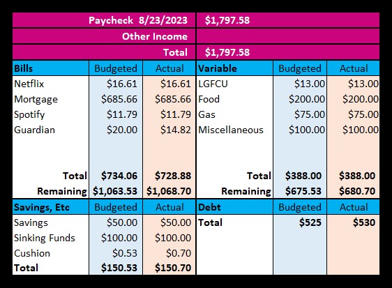 So! First and foremost I got paid on Wednesday. 😊 Second…it was a whole penny short of my budgeted amount. Next, Spotify increased their charges by $1 and with tax, my bill went up $1.09. Nothing ground breaking that I can’t handle. Next, I got my amount for Guardian (my water bill) and I was under budget for it. With my variable spending, everything is as planned with the exception of LGFCU. I’ll be paying $13 instead of the normally quoted $14, but we’ll see. Savings is the final thing I need to talk about. I made the decision to increase my sinking funds to $100 for now…I have my new amount for taxes for my car and I was going to wing it next year but I feel safer giving it real effort. Especially considering my first tax bill will be $311 which is close to $150 more than what I was paying for my Rogue. Last, I expect to pay a total of $530 in debt but we’ll see how things go with the interest I’ll get with my accounts and anything I may or may not have left over in my budget.