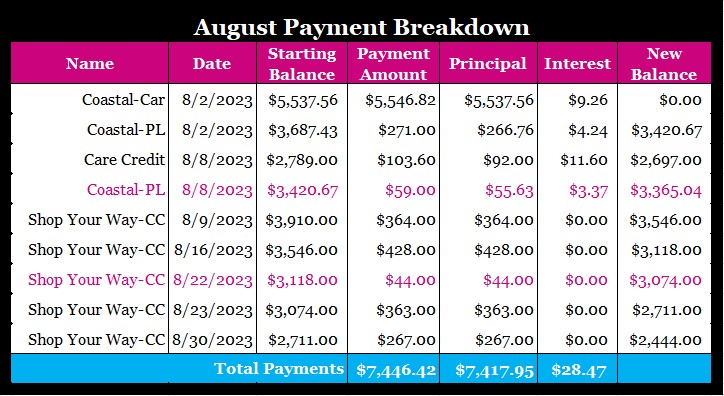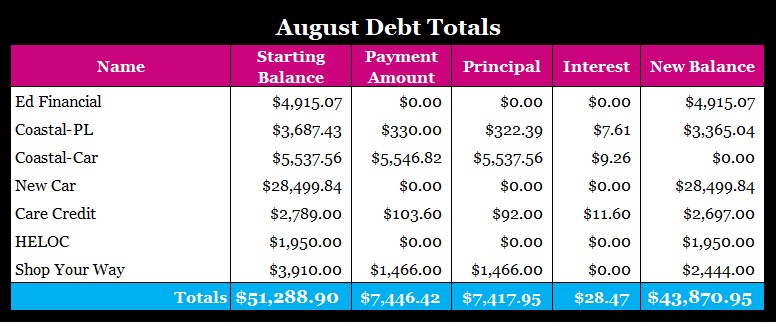 This is what my debt is looking about for the month of August. This number will change because of the improvements I’m making this month. If I didn’t have my financial sh*t together I might lose it. In the grand scheme of things, this is normally something I’d payoff in a very short amount of time and I’m not worried about it like I was with my newish car. 😊