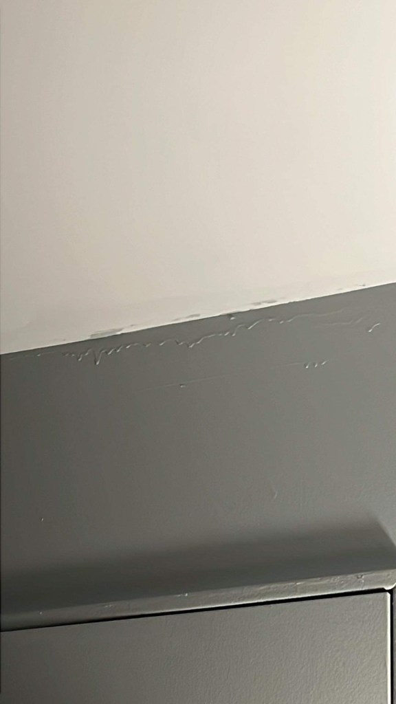When I get home this is when reality set in on how much of a sh*tty job they did. They ruined my entry way rug, got paint on my couch and one of the cushions, broke some of the magnets on my fridge, left sh*t and paint splatter all over my balcony (the dirty grill and leaves are my fault if you see the pic below), there are several spots where too much paint was used and there are drippings all over the place, they tracked paint all over my million-year-old carpet, there are a ton of spots all over my ceiling where the roller tapped it with the specialty color, they left my guest bedroom a mess, never replaced the outlet covers, a small wall was missed above my kitchen sink which isn’t surprising because my kitchen was a catastrophe. The counters were covered and they put all the dirty rollers and paint brushes in the sink. I can’t cook, I can’t do ANYTHING in the kitchen except bitch some more about it. I had a video chat with the person who offered the referral and they too were appalled. I have to be on video for work the next day and I’m just trying to figure out what the hell I’m supposed to do.