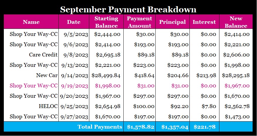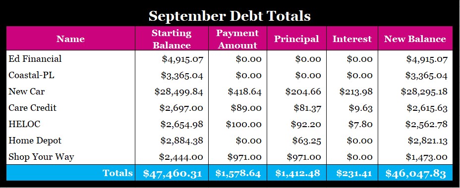 I still made great progress this month! This month my Shop Your Way credit card balance should be so close to being paid off that I’d just pay off in October if it weren’t for having to pay car taxes and registration. Yay me! Next up is Care Credit.