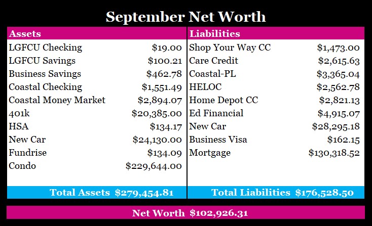 September was not a kind month and at the end, the stock market tanked a bit and my 401k balance, home value, car value, and Fundrise value all went down but my net worth is holding steady over $100k. I’m hoping this month will be kinder. I shouldn’t have any really major additions in debt now that the great paint debacle is over, but I can’t put anything past my life.