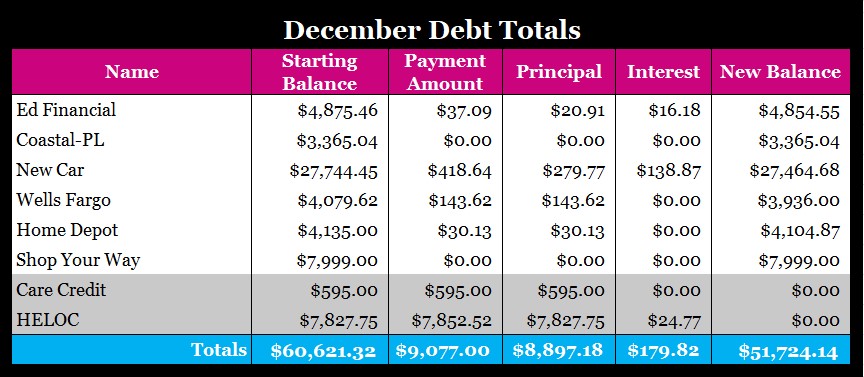 In the middle of all of this, I purchased new light fixtures, bought recessed lights for my ceiling, a new bathroom mirror, and had everything installed. This did cost me quite a bit but I figured I might as well since it was in the plan anyway. My house has MUCH better lighting that it did which makes things easier for me. I paid for everything out of my HELOC and still had a balance from when I had that trash work done on my house and when my car ended up with mold. I decided to do a balance transfer from my HELOC to my Shop Your Way credit card. All of this meant I had to come up with a new debt plan with the new numbers. Now…I’m MAXED OUT.
