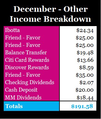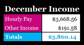 I purposefully left out November because I got some very hefty deposits because of the work I had done on my house but this is more realistic with a few extras. I did adjust my withholdings for the end of the year and will leave it as is through February of this year and that’s why my hourly pay is higher than normal. This was a pretty good amount of extra income so I decided to provide a visual of what it all included. Here is how it was broken down: