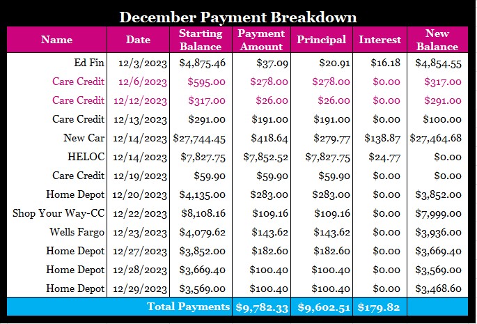 Hi and hello! I’m super proud to say that I managed to make it through 2023 with all of the off the wall things that happened. I’d so love to embrace 2024 without any abandon, but I’m entering the new year cautiously. Funny thing though…there were two more instances that 2023 had to show me it was the boss and not me. Before Christmas, I went in for a trim and left with a full-blown haircut. Dude cut like 3 inches off my hair which was a major setback because I have a goal to donate hair. So back to the drawing board for that. Next…Friday right before New Year’s…my garbage disposal decided it wanted to stop working. So now I have yet another home project to sink money into. Yay me. In comparison to how my entire year was, that wasn’t great, but it wasn’t the worst that 2023 had to offer me. The biggest pill to swallow is that I got as low as $20,839.06 with my debt and I now have over $30k more than that. I could cry real tears if I had nothing to show for either. I did buy another car and had to have new flooring installed in my house. Both are awesome. We’ll get into the breakdown for the end of December 2023 and what my life looked like. Do know that I’ve been doing my damnedest to get back on the right path. Without further ado! Let’s go grab ourselves a snack and a drink to wash away our sorrows with and we’ll get started!