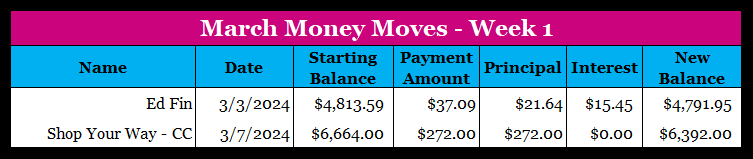 Before I made that decision, I took a look at how that would impact my debt payoff and if I’d meet the expiration dates for my balance transfers and promotional balances. All is well so I fired up the contribution and it’ll take place in my paycheck next week. This will make a $100 difference in my paycheck. It also makes sense because I did receive a merit increase effective 3/6/2024.
