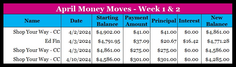 For the past two weeks I think I’ve done a pretty good job of making payments and working on these balances. I put a sexy dent in my Shop Your Way credit card and that balance is going down tremendously. I also made a small payment to my student loan like I do every month. It’s not much but it’s enough to cover the interest and principal for the loan.