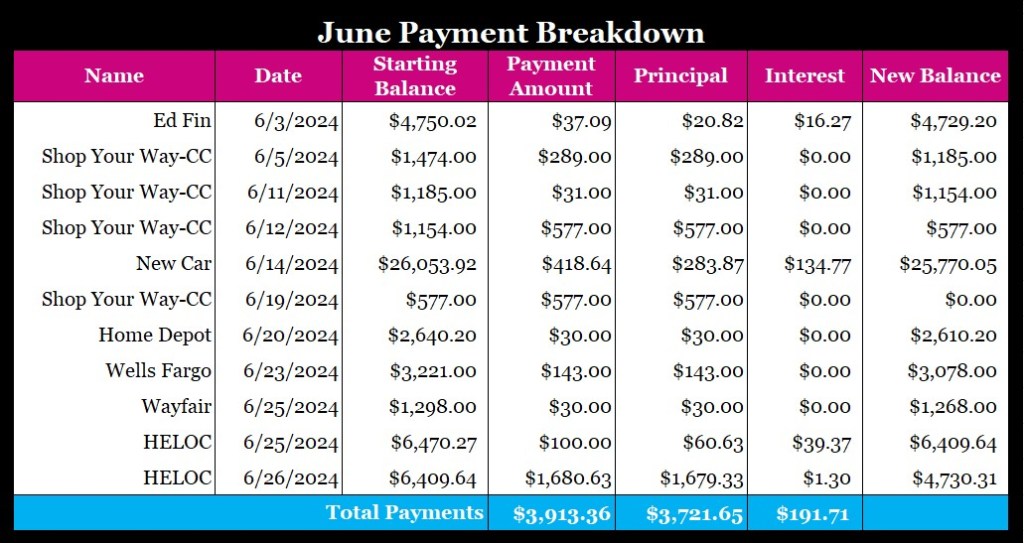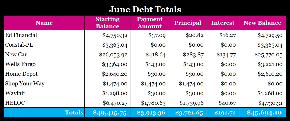 My Shop Your Way Credit Card IS PAID OFF!!!!!! Again. The plan is to not do anymore balance transfers to this card. My next debt that I’ll be focusing on is my Coastal-PL. I have more to share next week before I state what my complete plan is because we all know…I like to change things up constantly. I’ll explain what’s going on with my HELOC later on the post. Other than that, every other payment was kind of anticlimactic. Nothing fancy at all.